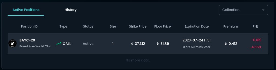 After purchasing an NFT option, you can find your position in the "Active Positions" tab.